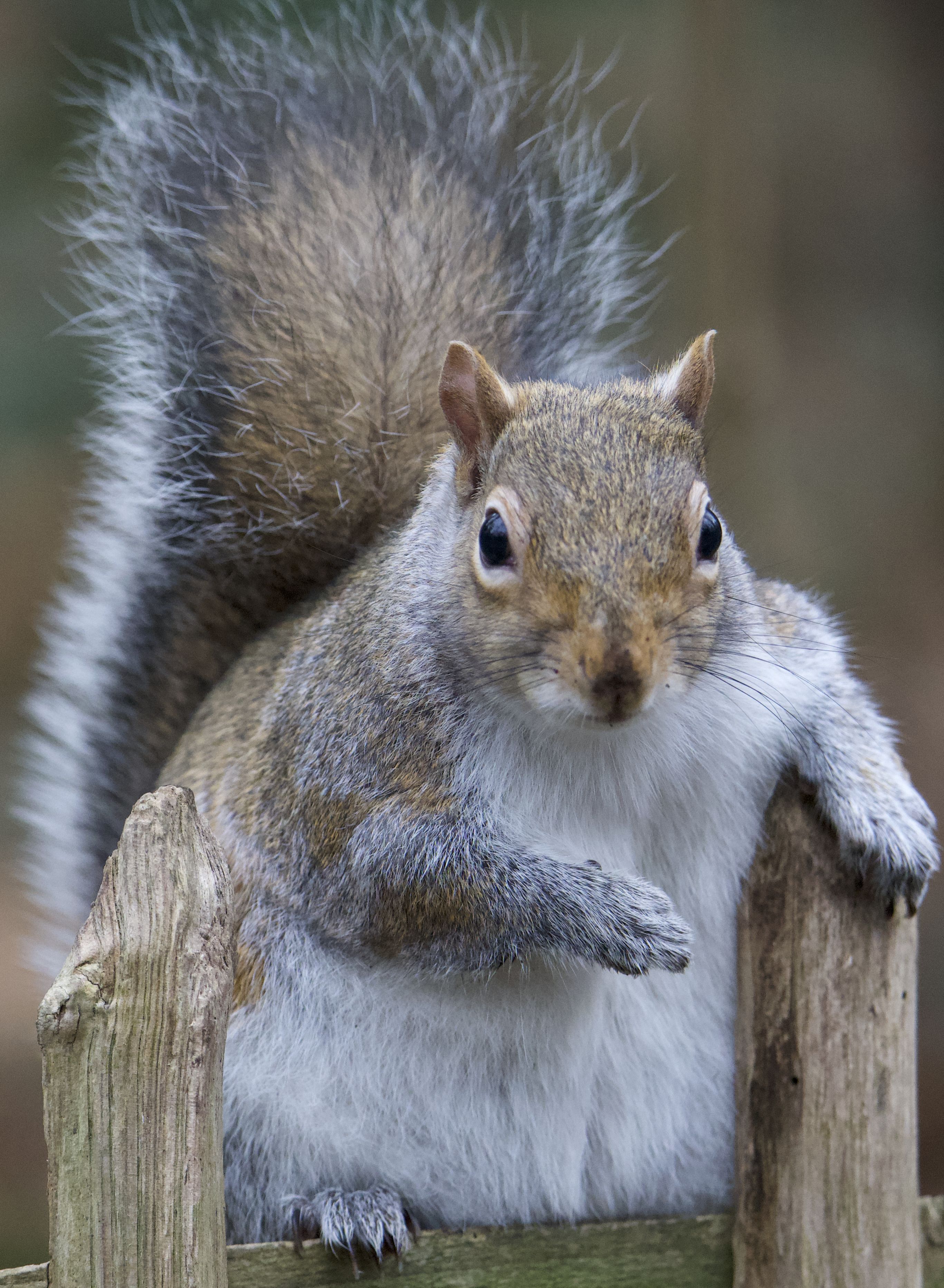 A close-up of a gray squirrel sitting on a wooden fence with its bushy tail.